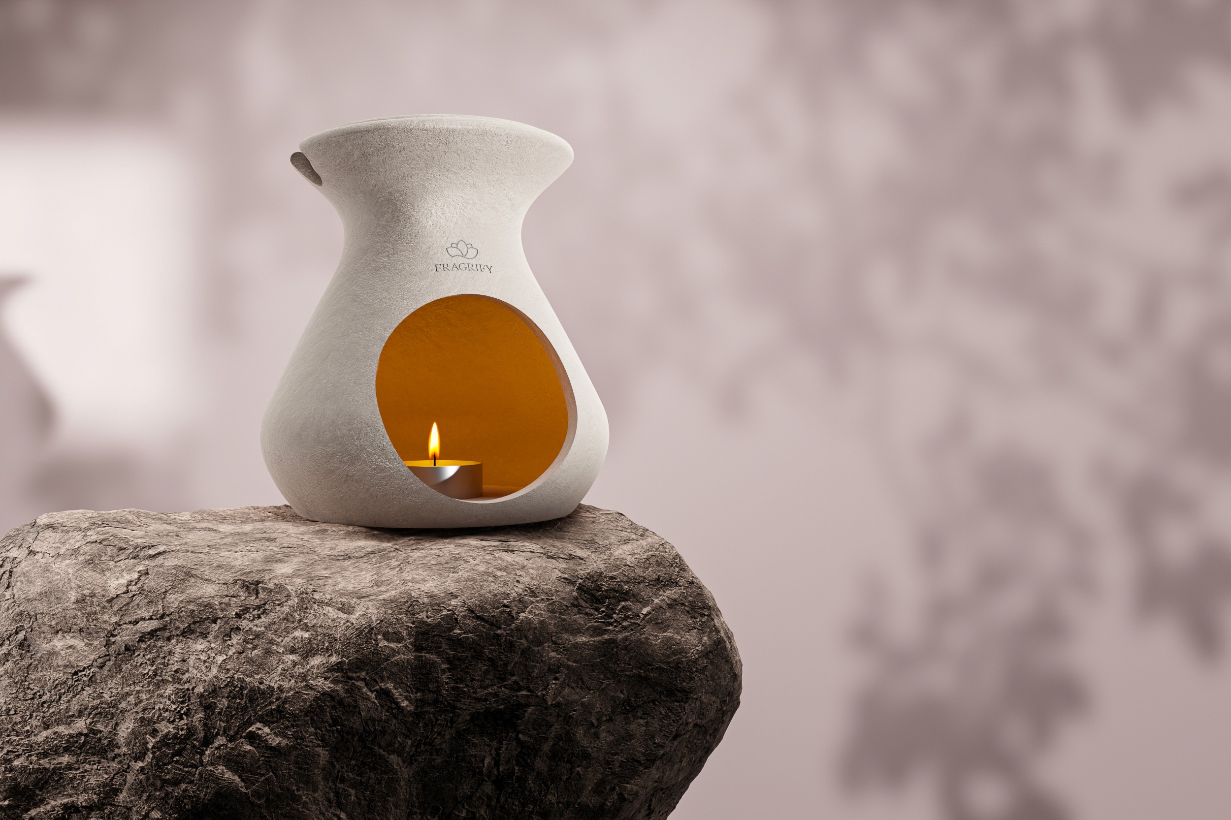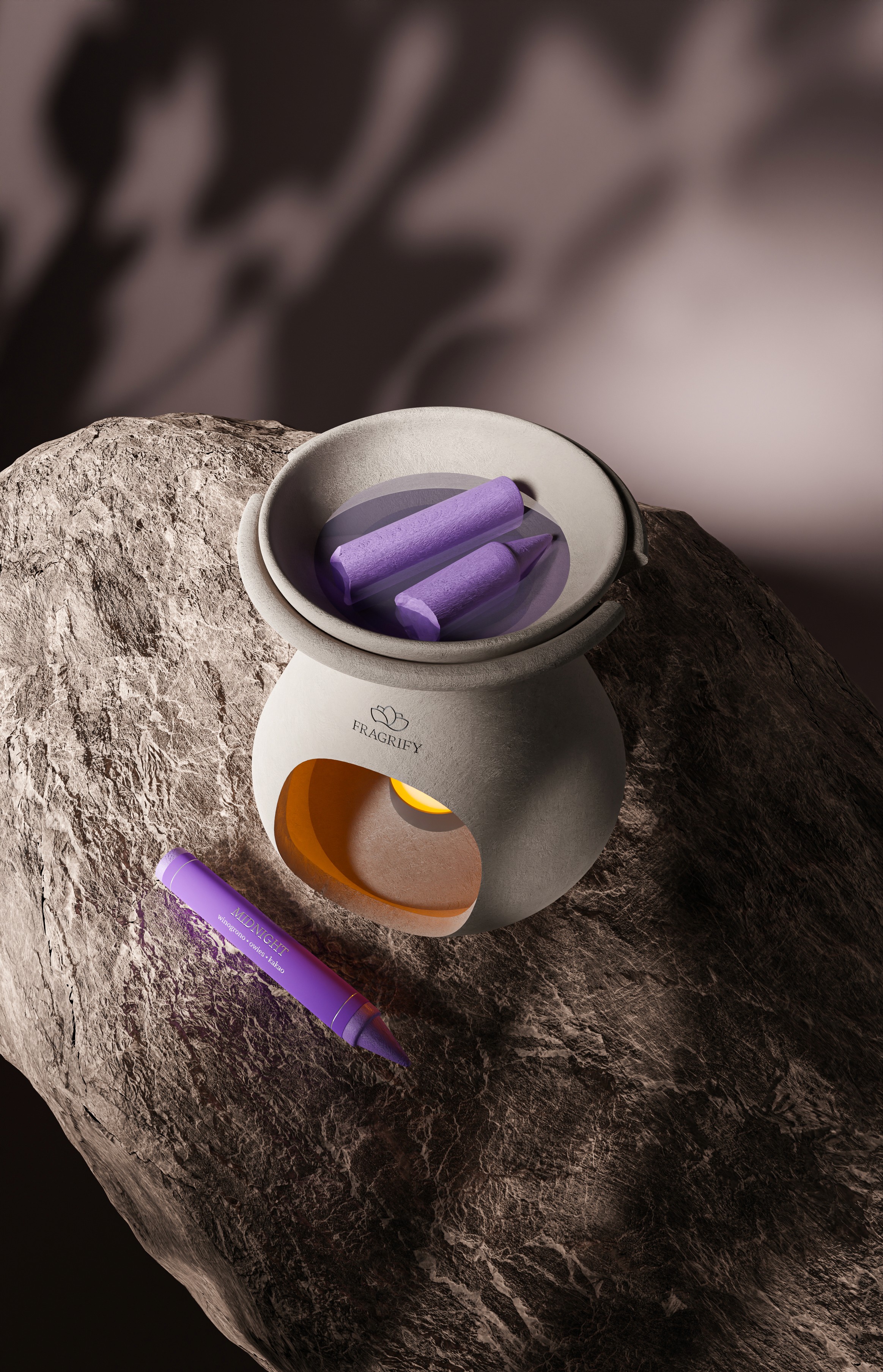 The fragrance burner designed for the Fragrify brand is a thoughtfully developed product within the field of industrial design. The ceramic wax warmer was created with a strong focus on user convenience and ease of maintenance. A key structural feature is the liftable tray positioned at the top, equipped with subtle indentations that facilitate easy removal and everyday use.