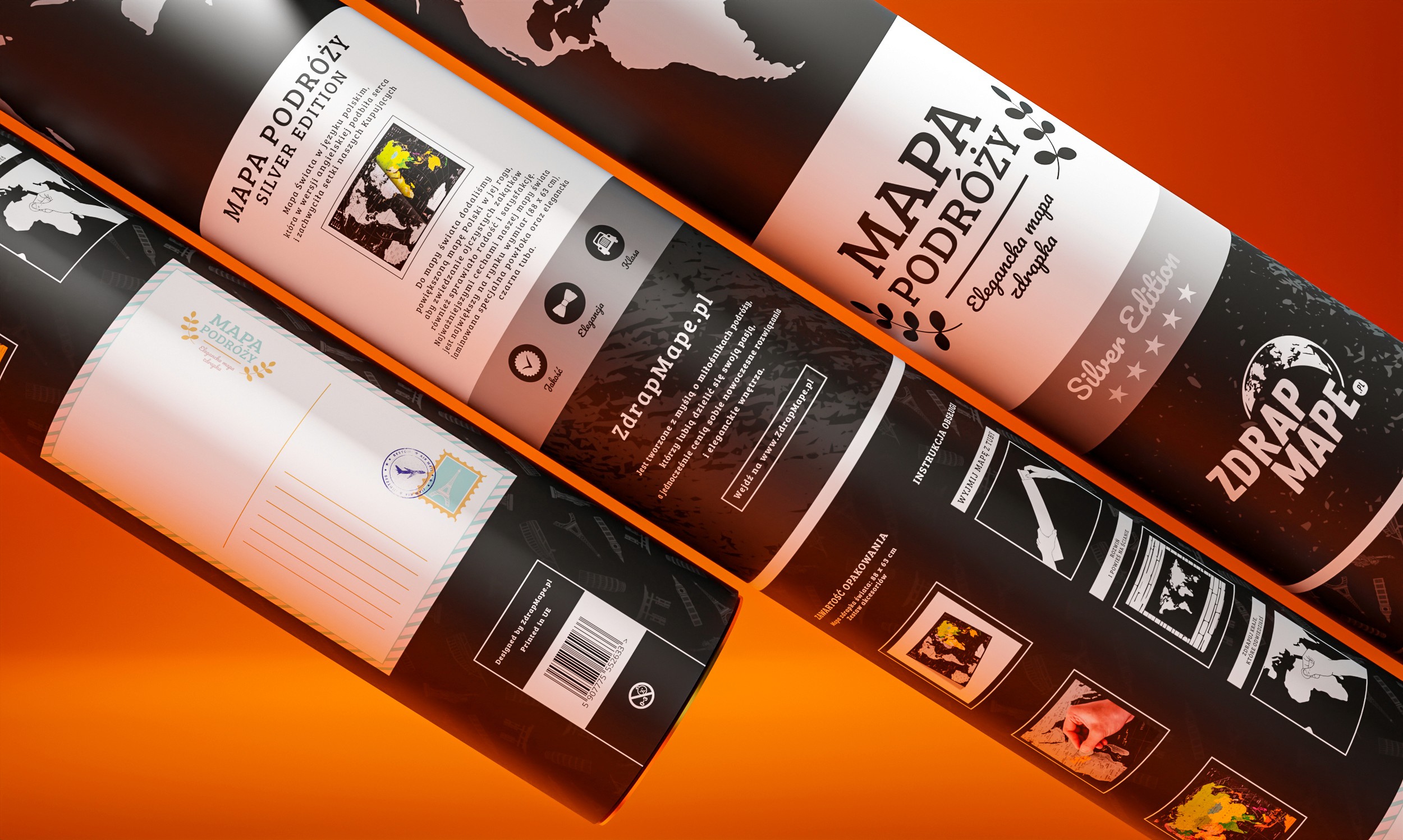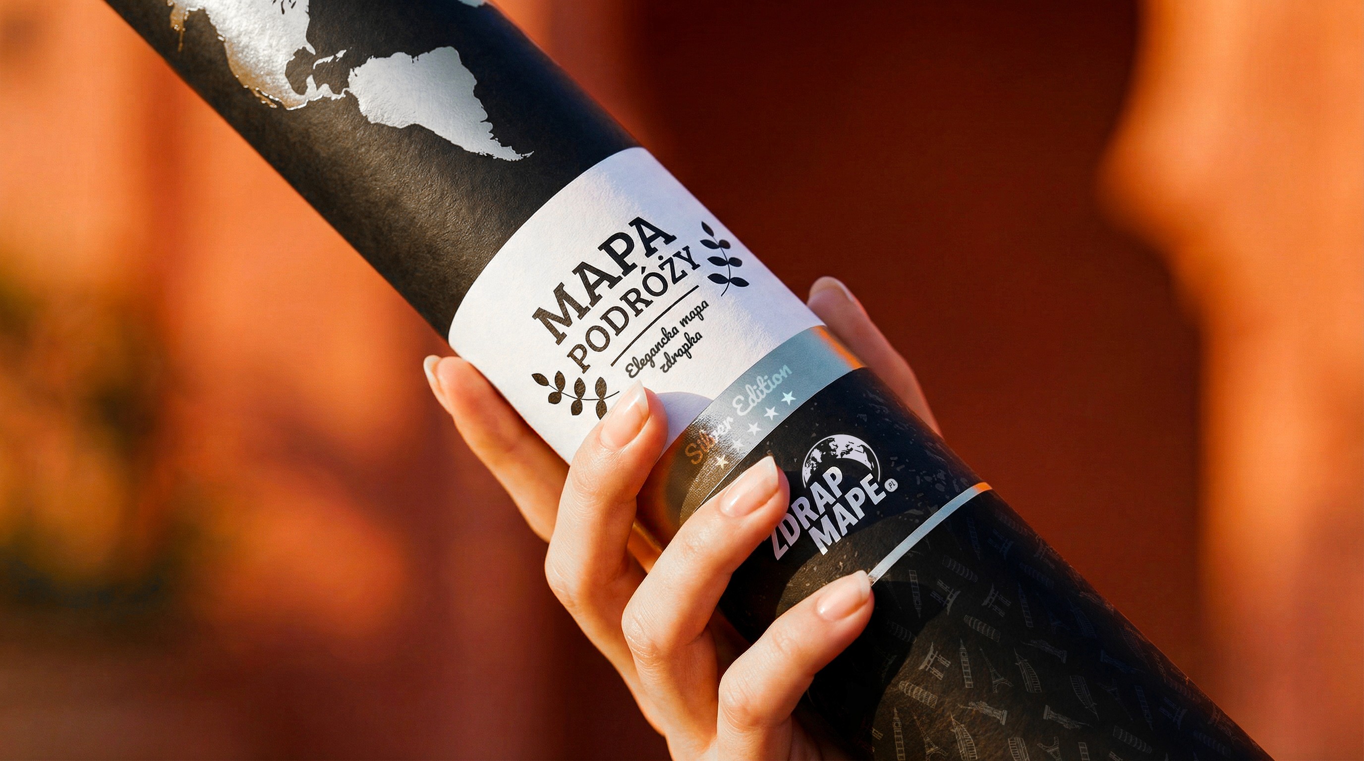 Packaging design for a scratch-off map developed for the brand Zdrapmape.pl, created with a strong focus on its gifting function as a key element of the user experience.